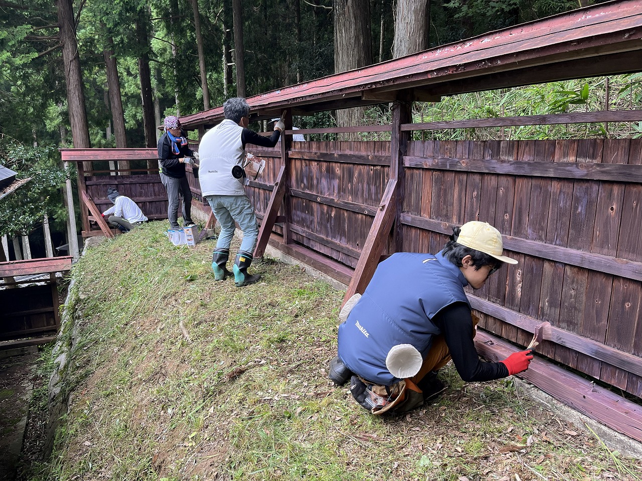 神社の板塀のいたべいが雨で傷んできたため、保護のためベンキをぬりました